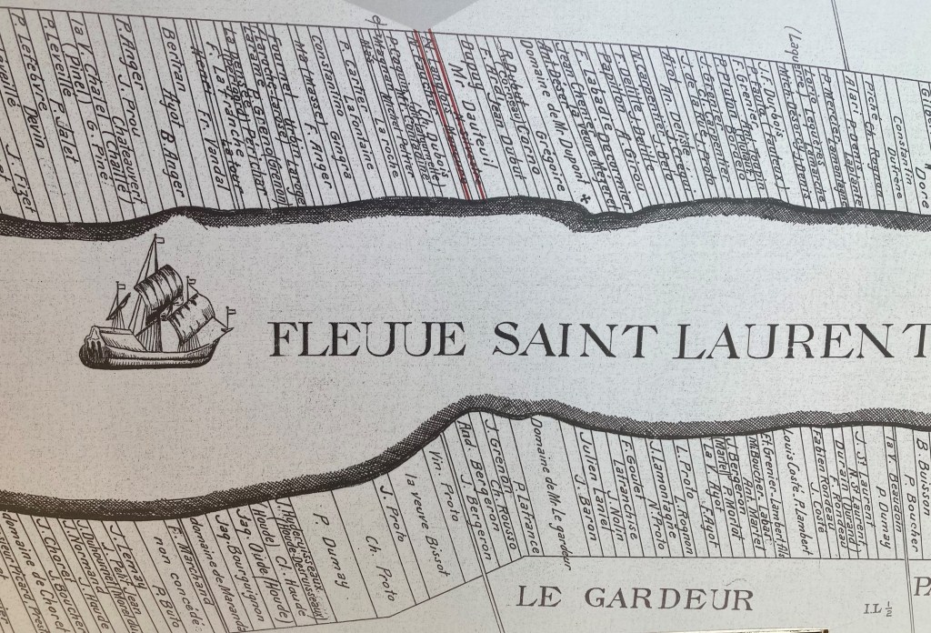 On peut voir plus bas, au milieu de cette carte ancienne des premiers temps de la colonie, la terre de Nicolas Langlois située sur la rive nord du fleuve Saint-Laurent. C’est la concession de terre que Jean Bourdon, Seigneur de la Seigneurie de Dombourg lui a octroyé il y a presque 350 ans. Elle est indiquée avec le libellé N. Langlois. Certains auront peut-être besoin d’une loupe comme moi. Pendant ma visite, on m’indiquera que la famille Langlois avait aussi acheté ultérieurement la concession qui lui est adjacente. À gauche, si je me souviens bien.